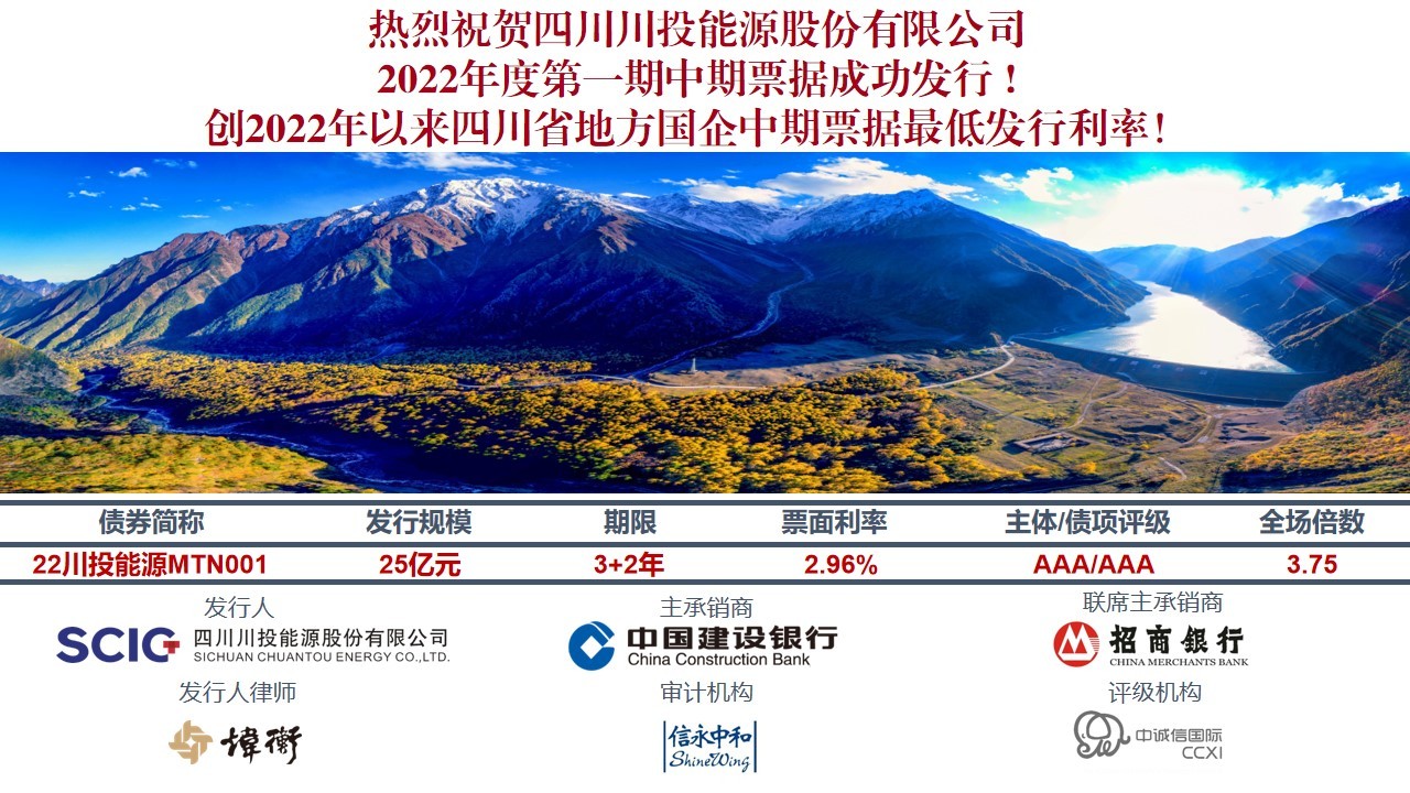 5月20日,川投能源公司2022年度第一期中期票據25億元成功發(fā)行。本期中期票據發(fā)行規(guī)模為25億元,發(fā)行利率2.96%,全場倍數3.75倍。