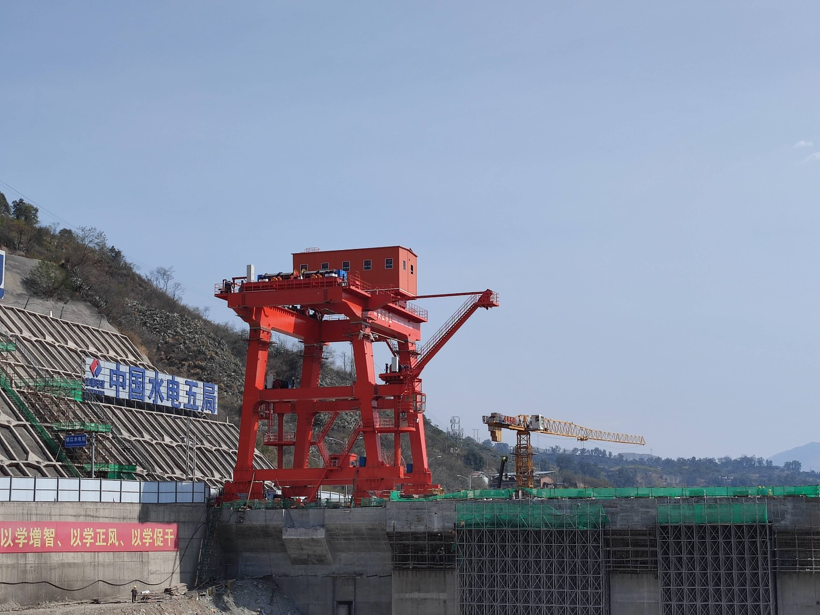 紅色門機(jī)迎江矗立。“大吊車真厲害,百噸設(shè)備輕而易舉提抓起來!”今年以來,攀枝花廣大市民陡然發(fā)現(xiàn)銀江水電站大壩上架起了一個紅色的大型設(shè)備,從幾公里外的市區(qū)一眼望去就能映入眼簾,成為銀江水電站的新標(biāo)志。這個紅色巨物就是壩頂門機(jī),高25米,寬16米,最大起吊能力達(dá)到500噸,起升高度達(dá)75米。是水電站建設(shè)期金屬結(jié)構(gòu)安裝及后期電站運行最重要的設(shè)備之一,2024年將肩負(fù)起包括36扇閘門在內(nèi)共計超萬噸的設(shè)備起吊任務(wù)。為順利推進(jìn)施工,開年以來,川投能源攀水電公司通過增加臨時軌道提前籌備、堅持春節(jié)不停工等措施,加快實施壩頂門機(jī)供貨安裝,計劃4月中旬投入使用。