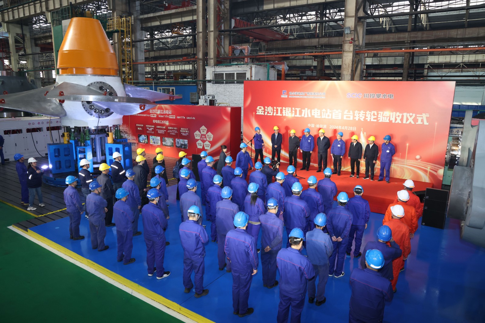 在儀式上,各方聽取了轉(zhuǎn)輪研發(fā)設(shè)計(jì)、加工制造及驗(yàn)收情況,對(duì)各項(xiàng)技術(shù)指標(biāo)進(jìn)行了現(xiàn)場(chǎng)檢測(cè),均達(dá)到優(yōu)良,順利通過(guò)驗(yàn)收。王貴對(duì)參加驗(yàn)收的人員表示熱烈歡迎,介紹了哈電集團(tuán)推進(jìn)國(guó)家清潔低碳安全高效能源體系構(gòu)建和“雙碳”戰(zhàn)略目標(biāo),以及近年來(lái)哈電電機(jī)公司在原創(chuàng)技術(shù)策源地、數(shù)字化智能化、產(chǎn)能提升工程建設(shè)方面取得的重大進(jìn)展,并表示川投集團(tuán)與哈電集團(tuán)將以銀江水電站為合作契機(jī),繼續(xù)合力攻堅(jiān)克難、勇攀行業(yè)高峰,推動(dòng)中國(guó)乃至世界清潔能源裝備研發(fā)制造能力邁上新的高度,進(jìn)一步深化務(wù)實(shí)合作,共謀創(chuàng)新發(fā)展,共同努力為促進(jìn)經(jīng)濟(jì)社會(huì)發(fā)展全面綠色轉(zhuǎn)型、為全面建設(shè)社會(huì)主義現(xiàn)代化強(qiáng)國(guó)貢獻(xiàn)力量。