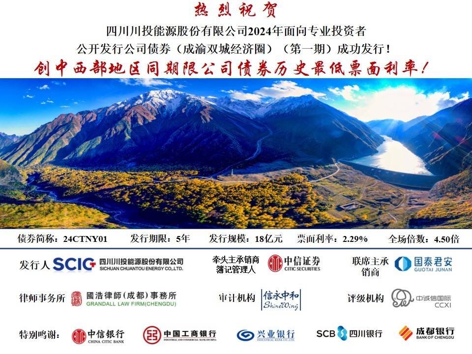 7月10日,川投能源2024年面向專業(yè)投資者公開發(fā)行公司債券(成渝雙城經(jīng)濟圈)(第一期)成功發(fā)行。本期公司債券發(fā)行規(guī)模18億元,期限5年,票面利率2.29%,創(chuàng)中西部地區(qū)同期限公司債券歷史最低發(fā)行票面利率。