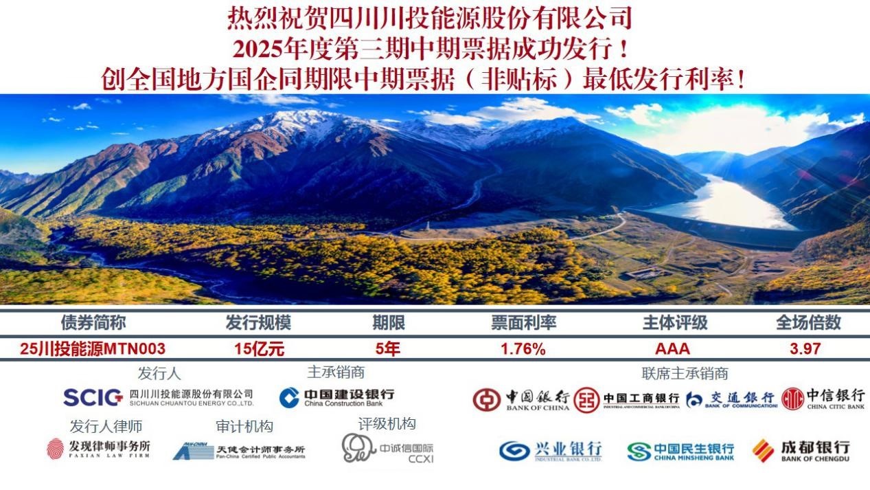 6月24日,川投能源搶抓資本市場有利時(shí)間窗口,成功發(fā)行2025年度第三期中期票據(jù)。本期中期票據(jù)發(fā)行規(guī)模為15億元,發(fā)行期限5年,發(fā)行利率1.76%,創(chuàng)全國地方國企同期限中期票據(jù)(非貼標(biāo))最低發(fā)行利率,同時(shí)也創(chuàng)公司中長期債券歷史最低發(fā)行利率。