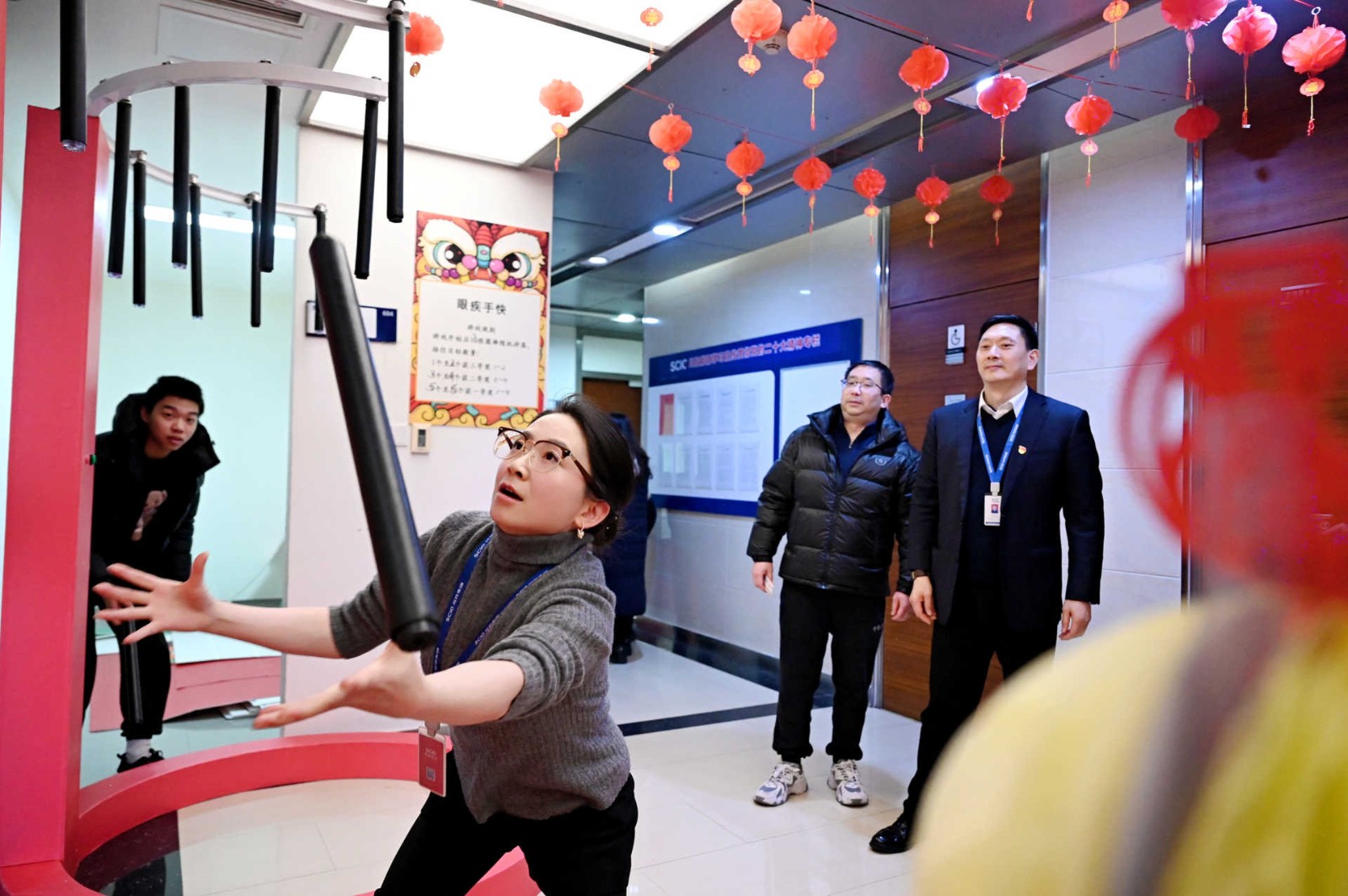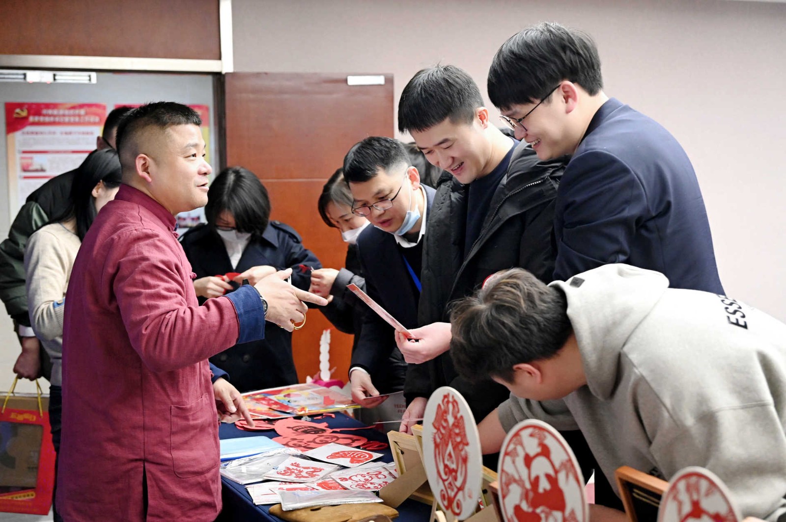 此次活動(dòng)采用游園方式,現(xiàn)場設(shè)置了民俗體驗(yàn)區(qū)、非遺手作區(qū)、民俗體驗(yàn)區(qū)、新春互動(dòng)區(qū)、游戲互動(dòng)區(qū)等5個(gè)活動(dòng)區(qū)域,涵蓋猜燈謎、剪窗花、做龍燈、滾滾樂等8個(gè)活動(dòng)。活動(dòng)現(xiàn)場每一處都用心裝扮,火紅的中國燈籠、精美的傳統(tǒng)對(duì)聯(lián)伴隨濃郁的新年味道彌散在會(huì)場的每一個(gè)角落。大家爭先恐后、玩勁十足,盡享新春的熱鬧與喜悅!有的圍著掛著紅線繩的燈謎卡片,仔細(xì)閱讀謎語,認(rèn)真思考,沉浸在猜謎的樂趣中;有的圍在四川剪紙非遺傳承人莊叢燦老師周圍,一邊聆聽著剪紙的技巧,一邊仔細(xì)修理邊角,用心精雕細(xì)琢;有的在學(xué)習(xí)制作龍燈,他們展現(xiàn)出極高的熱情和創(chuàng)造力,根據(jù)自己的想象,給龍燈增添了各種裝飾,如彩紙、亮片等,使得每個(gè)龍燈都獨(dú)具特色。