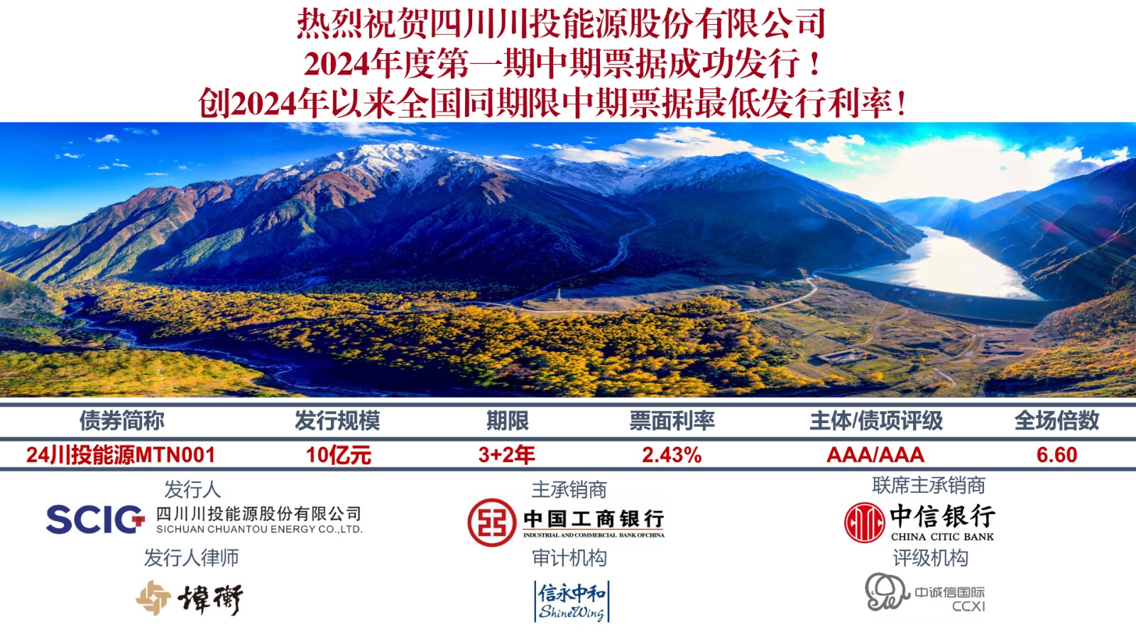 4月16日,川投能源搶抓資本市場有利時(shí)間窗口,成功發(fā)行2024年度第一期中期票據(jù)。本期中期票據(jù)發(fā)行規(guī)模為10億元,發(fā)行期限3+2年,發(fā)行利率2.43%,創(chuàng)2024年以來全國同期限中期票據(jù)最低發(fā)行利率,同時(shí)也創(chuàng)公司中長期債券歷史最低發(fā)行利率。