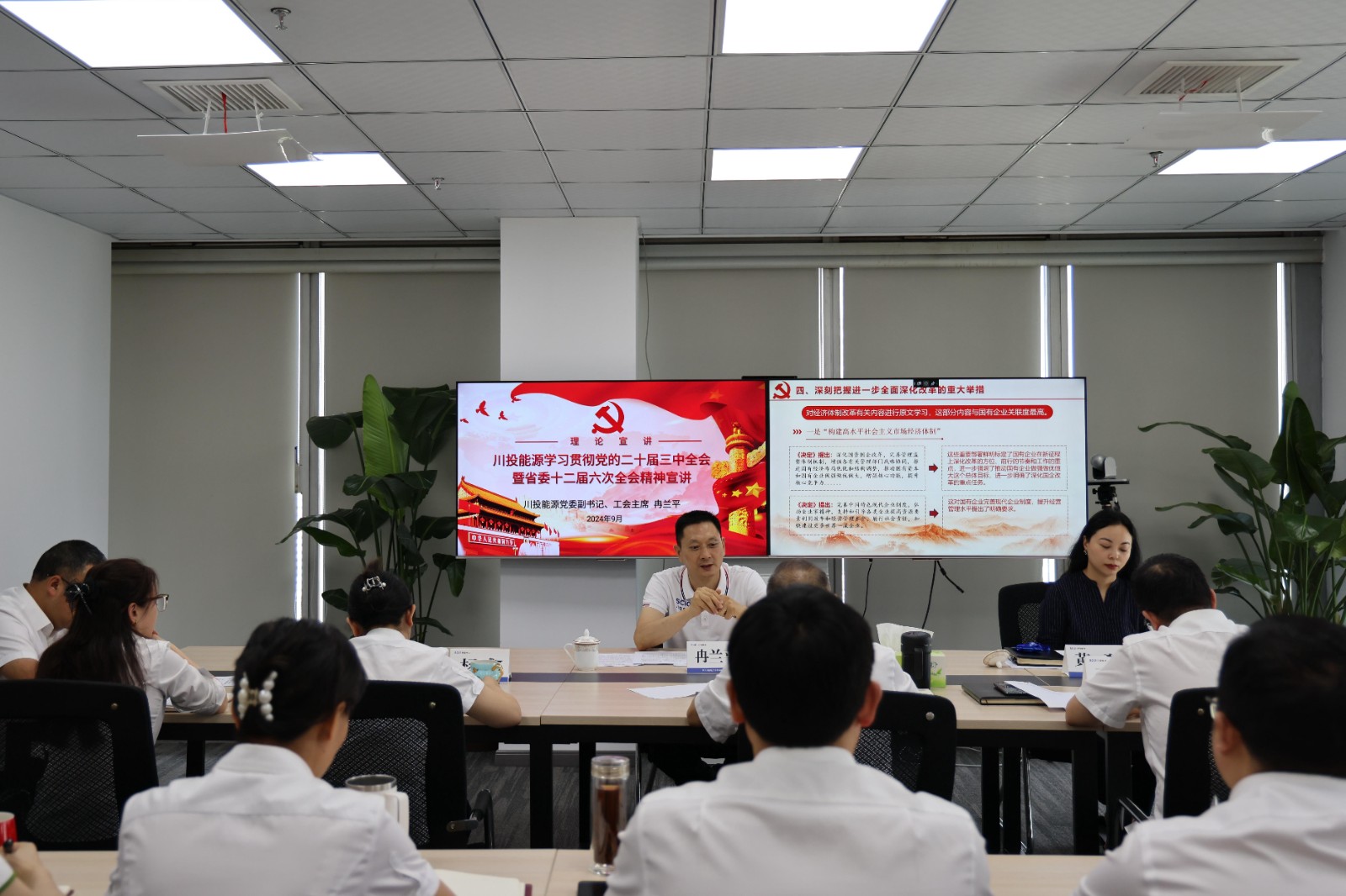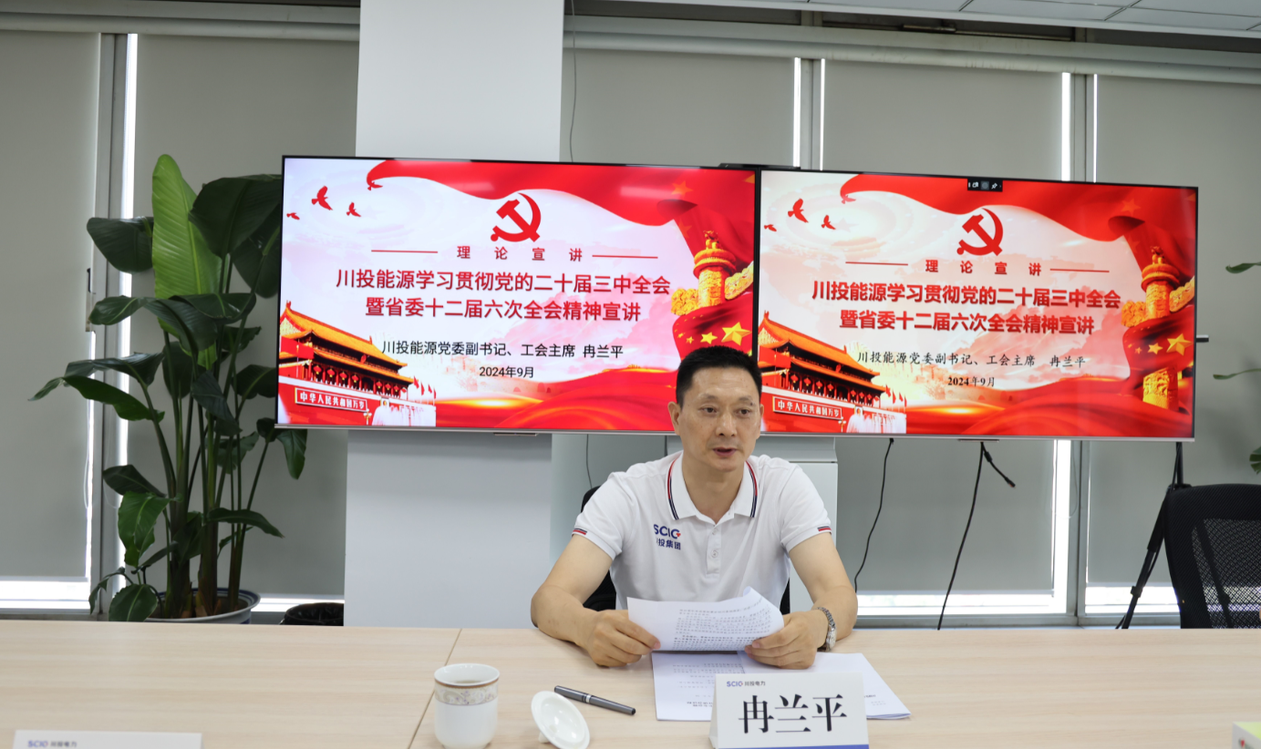 9月26日,川投能源黨委副書記、工會主席冉蘭平赴川投電力公司專題宣講黨的二十屆三中全會精神和省委十二屆六次全會精神,為進一步全面深化改革凝心聚力。川投電力黨委副書記、總經(jīng)理蔡承德主持會議。