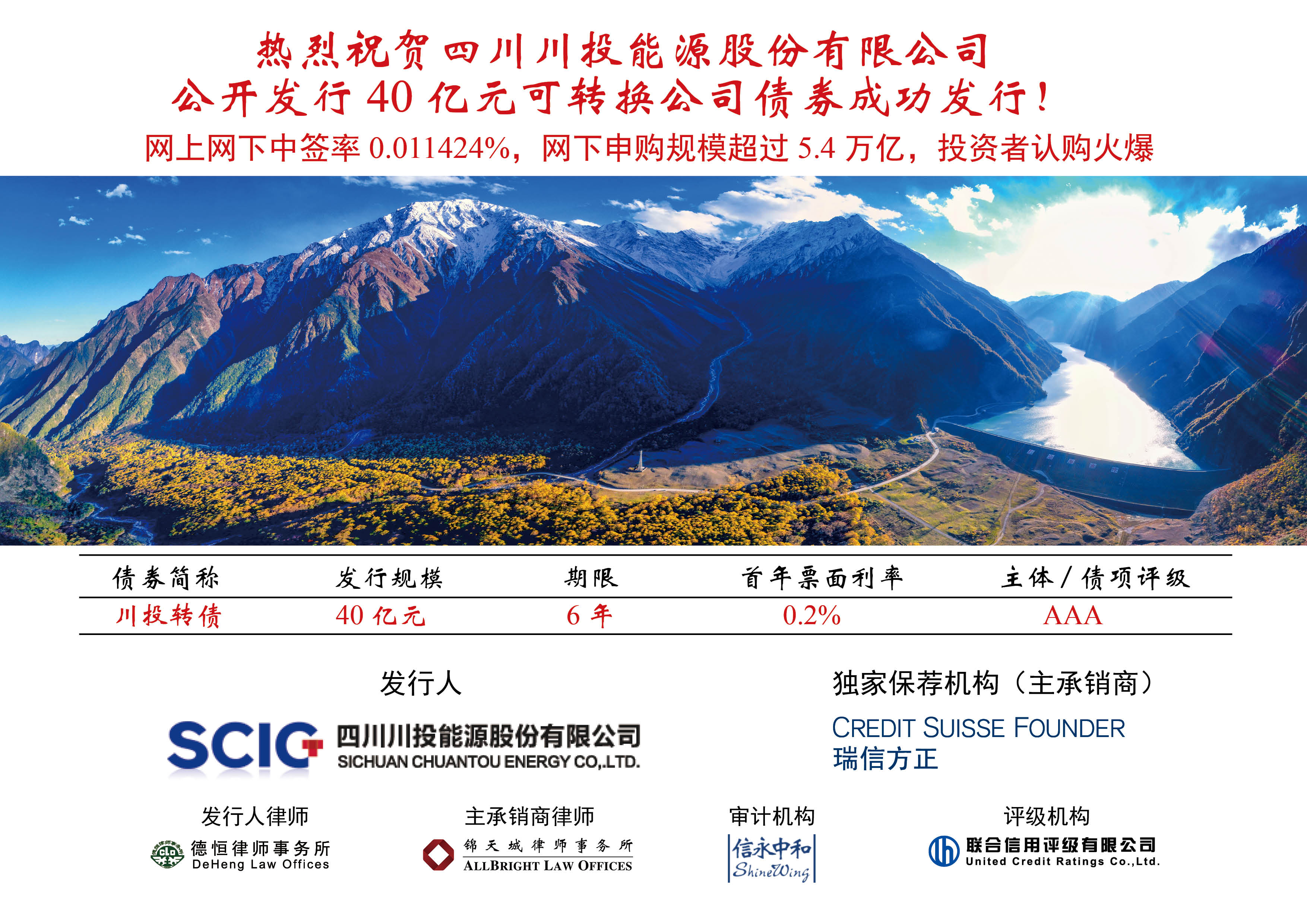 2019年11月15日,四川省投資集團有限責任公司(簡稱“川投集團”)控股四川川投能源股份有限公司(簡稱“川投能源”,600674.SH)公開發(fā)行A股40億元可轉(zhuǎn)換公司債券工作取得圓滿成功!40億元募集資金已全額到賬!這不僅是川投能源歷史上規(guī)模最大的一次融資,更標志著川投集團控股的川投能源上市公司6年資本市場融資工作實現(xiàn)破冰。對于川投集團和川投能源優(yōu)化融資債務(wù)結(jié)構(gòu),做優(yōu)做強做大能源主業(yè),以及促進四川省國有企業(yè)借助資本市場實現(xiàn)高質(zhì)量發(fā)展意義重大!