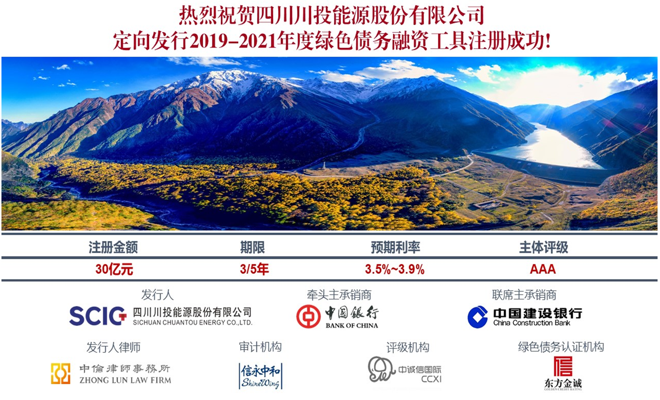 2月18日,川投能源迎來“定向發(fā)行2019-2021年度綠色債務(wù)融資工具”注冊成功的好消息。本次私募債注冊金額30億元,公司可在注冊額度內(nèi)分批次或一次性發(fā)行,募集資金將定向用于公司投資的綠色項目建設(shè),期限3/5年。此次為川投能源首次成功注冊私募債綠色債務(wù)融資工具,牽頭主承銷商為中國銀行。私募債發(fā)行利率將根據(jù)發(fā)行時的市場情況確定,預(yù)期在3.5%-3.9%之間(3-5年期限),遠低于同期限銀行貸款基準利率。