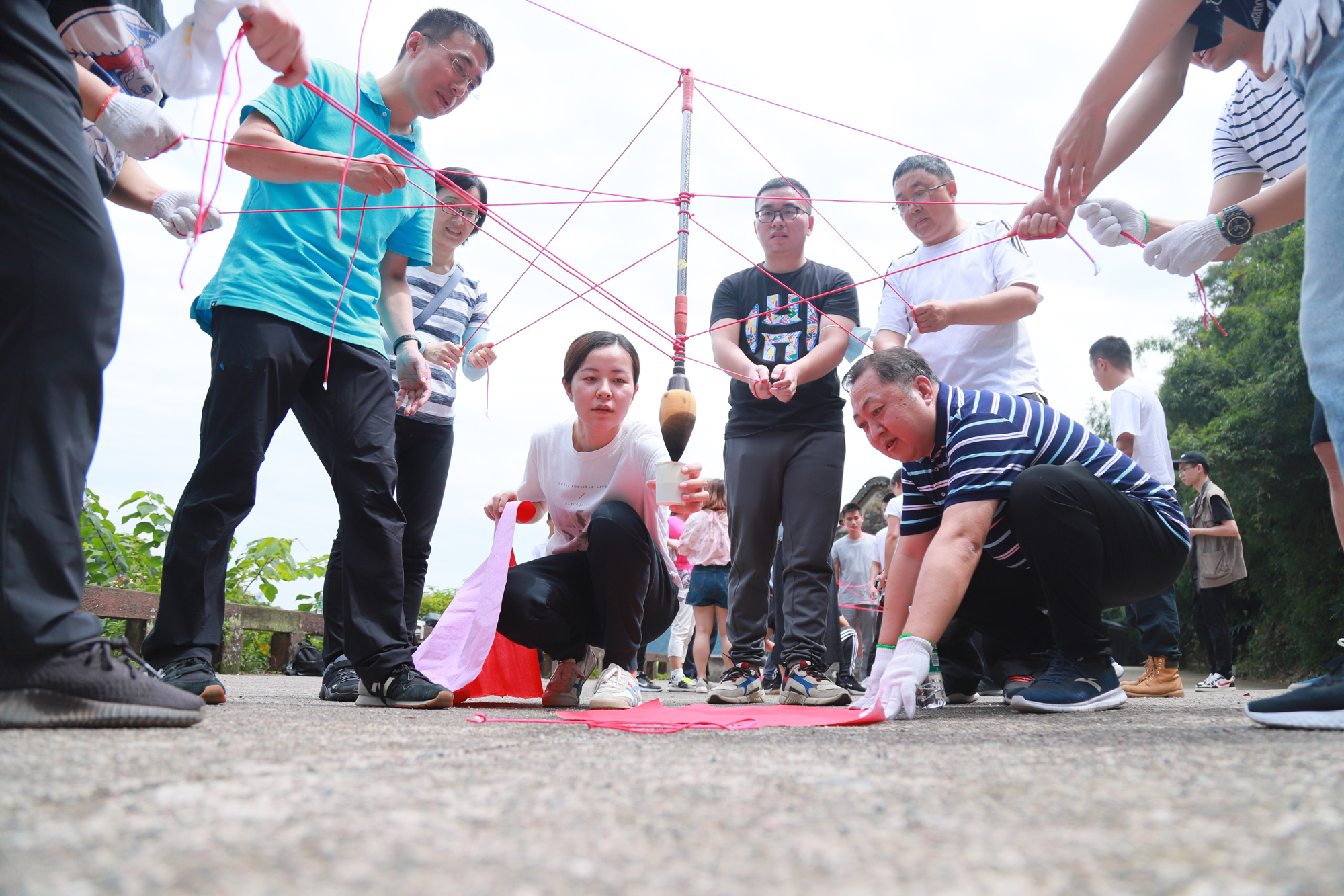 “人心齊,泰山移”。在“書寫傳奇”環(huán)節(jié),小組每個(gè)成員拉住綁有大毛筆的繩子末端,通力協(xié)作配合完成指定書寫文字,深刻啟發(fā)大家在工作中不僅要做好崗位工作,恪盡職守,還有學(xué)會(huì)合理分工,靈活變通,營造互幫互助、唇亡齒寒的全局觀念,為了團(tuán)隊(duì)目標(biāo)最終達(dá)成及時(shí)協(xié)作調(diào)整、鍥而不舍。“流血流汗不流淚,掉皮掉肉不掉隊(duì)”。在“飛奪瀘定橋”環(huán)節(jié),教練給各組分發(fā)隊(duì)員人數(shù)一半的泡沫墊,要求從起點(diǎn)出發(fā),借助泡沫墊且腳不觸地的情況下,全組隊(duì)員“一個(gè)都不能少”全數(shù)到達(dá)終點(diǎn)。各小組以斷金碎石的精神,堅(jiān)定信念,持續(xù)超越;在無障礙溝通的氛圍中感受眾人合力,不斷突破,熔煉團(tuán)隊(duì)。