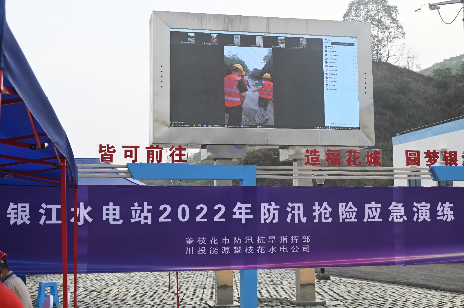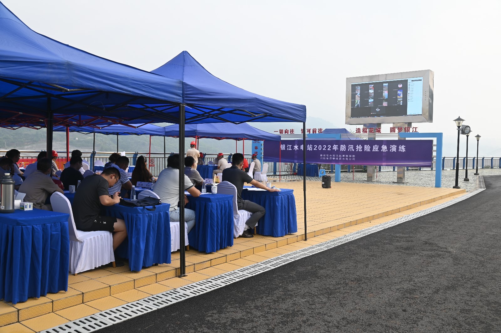 公司全體在攀領(lǐng)導(dǎo)和員工參加了本次演練,市發(fā)展改革委、市應(yīng)急管理局、市自然資源和規(guī)劃局東區(qū)分局、東區(qū)防汛抗旱指揮部、東區(qū)發(fā)改局、東區(qū)應(yīng)急管理局、仁和區(qū)防汛抗旱事務(wù)中心及銀江鎮(zhèn)等單位相關(guān)負(fù)責(zé)同志到場(chǎng)觀摩指導(dǎo)。長(zhǎng)江設(shè)計(jì)公司、貴陽(yáng)院監(jiān)理部、二灘建設(shè)監(jiān)理部、水電五局項(xiàng)目部、水電七局項(xiàng)目部、水電十局項(xiàng)目部、四川路橋項(xiàng)目部、水情測(cè)報(bào)中心、安全監(jiān)測(cè)標(biāo)等150余人參加了本次演練。