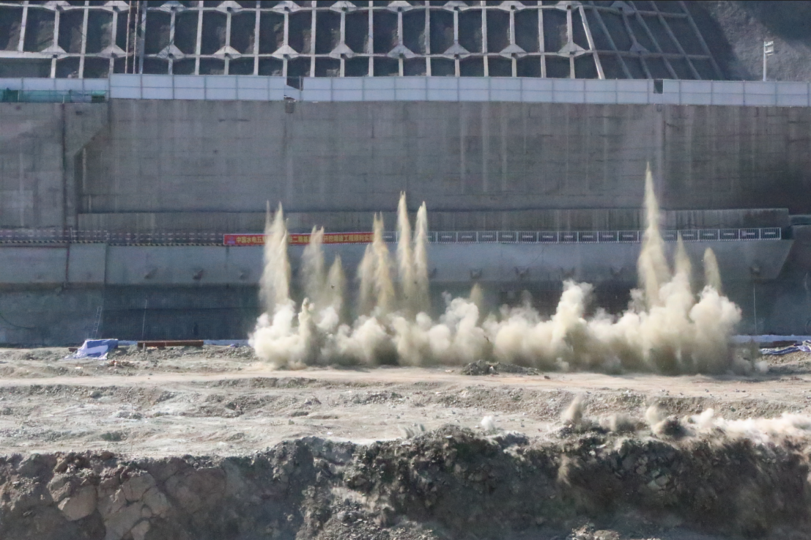 銀江水電站位于攀枝花市主城區(qū),二期基坑開挖施工外圍邊界條件復(fù)雜,左右岸各存在一條出入攀枝花市交通主干道(國道),此外,成昆鐵路渡口支線緊鄰左岸邊坡及二期基坑爆破區(qū),爆破施工屬涉鐵工程,爆破前需要辦理相關(guān)手續(xù)。公司先后多次組織參建單位召開專題會(huì)議研究涉鐵爆破事宜,施工單位積極落實(shí)審批備案手續(xù),多次往返于成都和攀枝花之間,歷經(jīng)曲折,終于在7月取得了鐵路、公安等主管部門批準(zhǔn),8月13日16點(diǎn)30分,隨著一聲巨響,二期基坑土石方開挖成功迎來“首爆”,主體工程建設(shè)正式邁入“快車道”。
