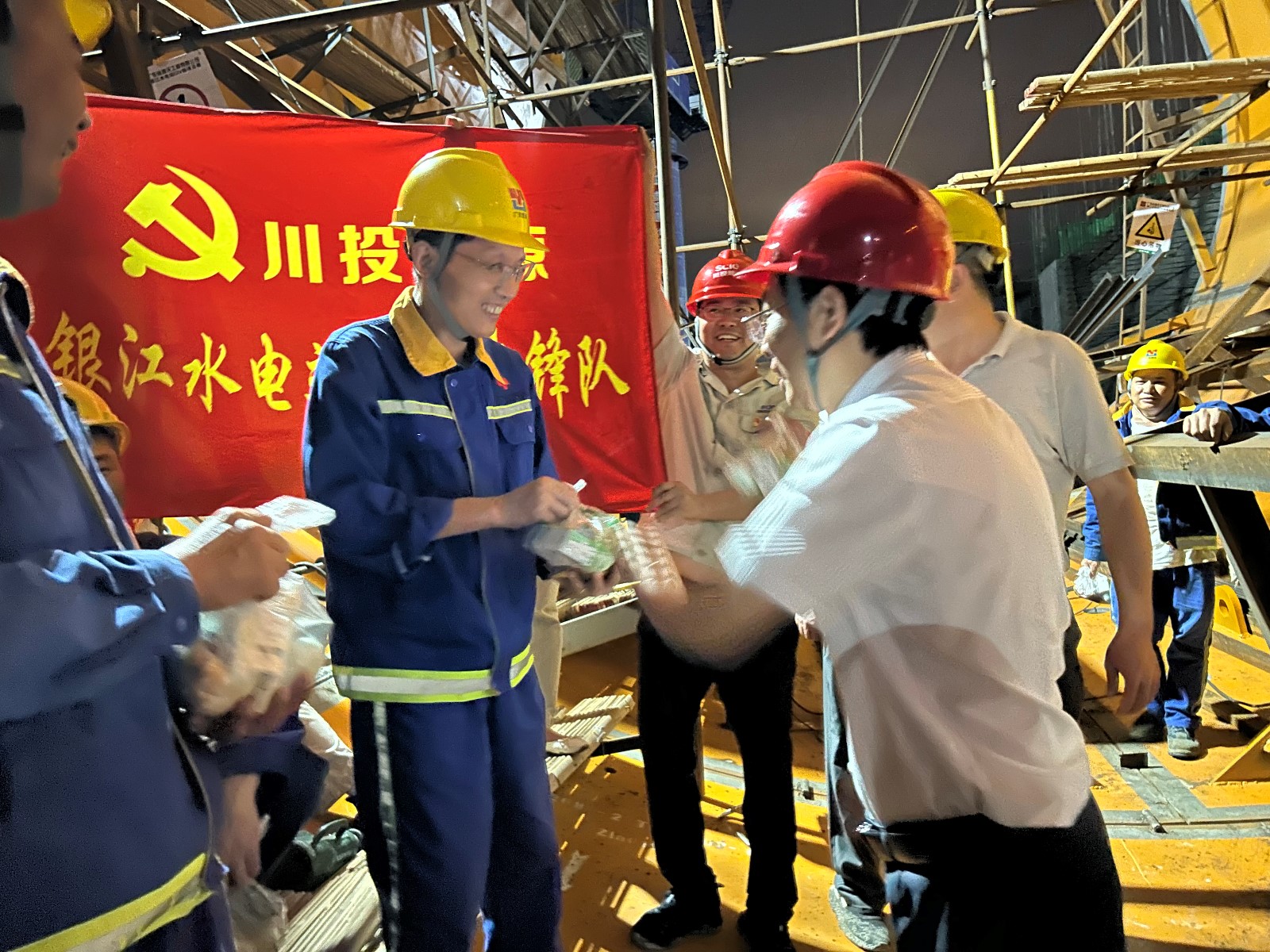 節(jié)日的銀江水電站施工現(xiàn)場,大壩混凝土澆筑、廠房尾水管機電安裝、混凝土拌和系統(tǒng)等各部位一片忙碌,為按期實現(xiàn)各項節(jié)點目標,800余名建設者依然奮戰(zhàn)在銀江水電站施工現(xiàn)場。夜晚的工地更是燈火通明,晚上九點,川投能源副總經(jīng)理,公司黨總支書記、董事長徐孝剛帶領公司黨員先鋒隊、志愿者服務隊,深入混凝土澆筑倉面、尾水管、拌合樓調度室、防汛值班室、變電站、保安亭等部位,將熱乎乎的雞腿、香噴噴的粽子等慰問品送到正在施工的每位工友手上。徐孝剛講到:“端午節(jié)是中華民族重要的傳統(tǒng)節(jié)日,對大家堅持奮戰(zhàn)在銀江水電站施工現(xiàn)場斗酷暑、戰(zhàn)高溫、挑燈夜戰(zhàn)表示感謝,祝福大家端午安康!”活動中,徐孝剛還開展了夜間安全檢查,叮囑大家做好防護、確保施工安全。