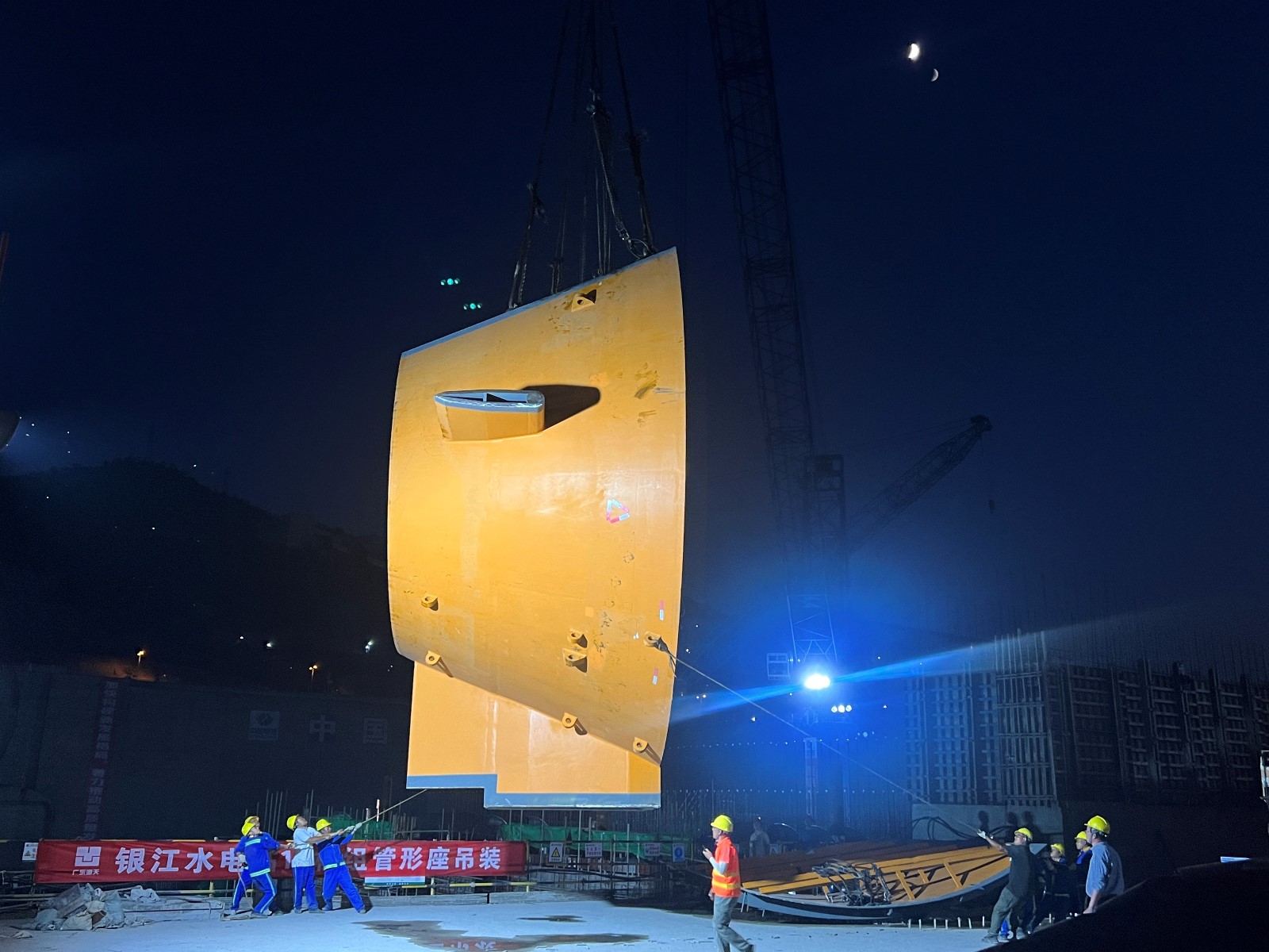 10月21日,在熱火朝天的銀江水電站建設(shè)工地,重達(dá)75噸的首臺(tái)機(jī)組管形座第一瓣內(nèi)殼在400t重型履帶吊車的吊裝下順利到位,標(biāo)志著銀江水電站工程建設(shè)全面進(jìn)入到機(jī)組安裝階段。