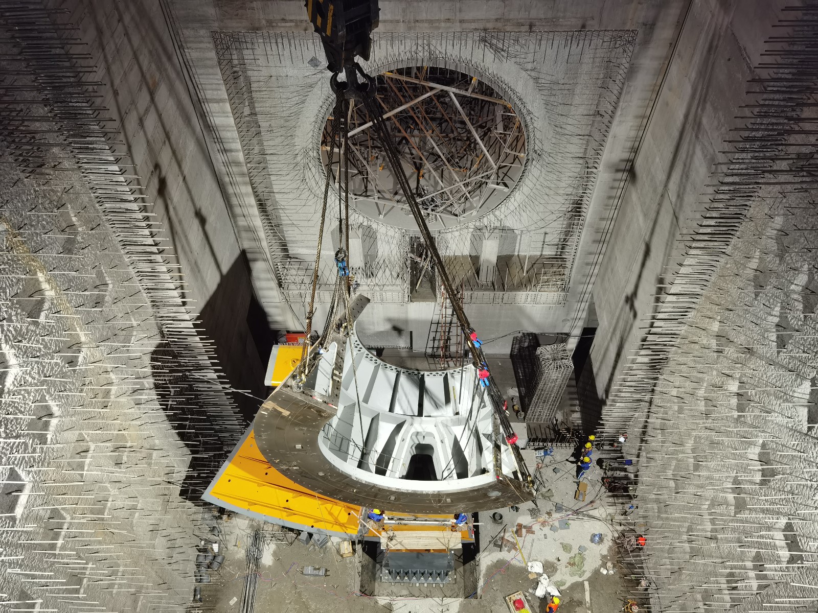 10月20日履帶吊車試吊驗(yàn)收及下固定導(dǎo)葉順利吊裝完成后,從20日16點(diǎn)開始至21日20:00結(jié)束,歷經(jīng)運(yùn)輸、翻身及吊裝三個(gè)階段長(zhǎng)達(dá)18個(gè)小時(shí)工作,管形座最重件第一瓣內(nèi)殼在公司領(lǐng)導(dǎo)的現(xiàn)場(chǎng)指導(dǎo)下穩(wěn)穩(wěn)落至安裝位置,后續(xù)公司將組織參建單位一鼓作氣將首臺(tái)機(jī)組管形座剩余內(nèi)殼、外殼、前錐體及固定導(dǎo)葉等悉數(shù)吊裝到位,力爭(zhēng)年底完成安裝工作,為實(shí)現(xiàn)2025年一季度首臺(tái)機(jī)組投產(chǎn)發(fā)電目標(biāo)打下堅(jiān)實(shí)基礎(chǔ)。