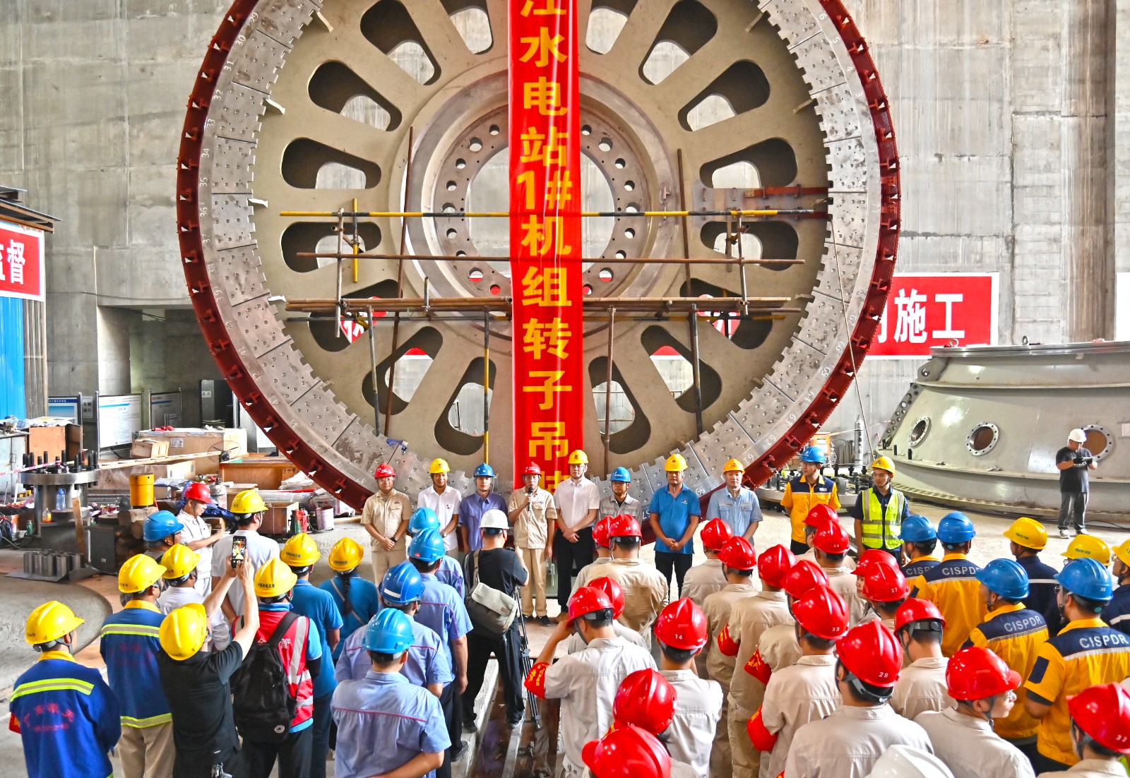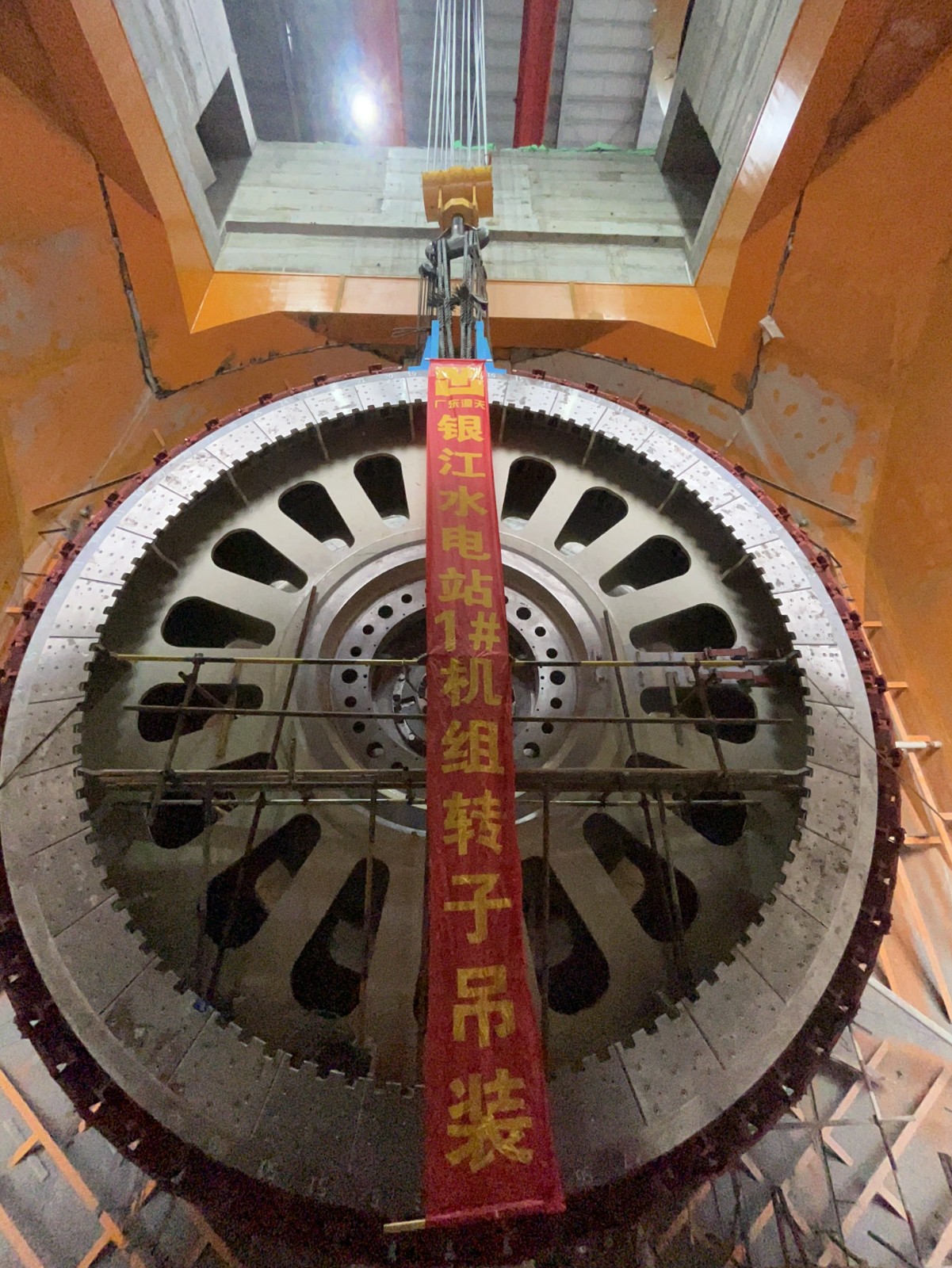 8月25日下午,銀江水電站首臺機(jī)組轉(zhuǎn)子順利吊入機(jī)坑并與機(jī)組主軸連接就位。