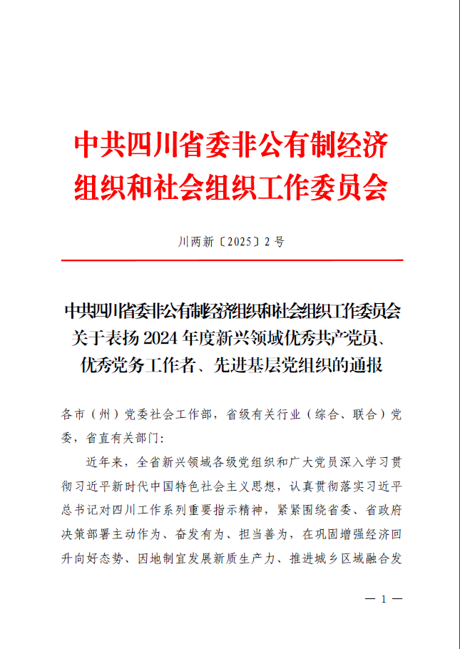 近日,中共四川省委非公有制經(jīng)濟(jì)組織和社會組織工作委員會印發(fā)《關(guān)于表揚(yáng)2024年度新興領(lǐng)域優(yōu)秀共產(chǎn)黨員、優(yōu)秀黨務(wù)工作者、先進(jìn)基層黨組織的通報》,川投能源黨委交大光芒黨總支獲評“四川省2024年度新興領(lǐng)域先進(jìn)基層黨組織”稱號。