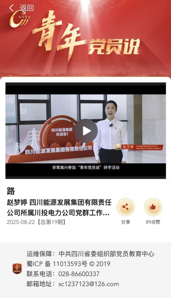 近期,四川省委組織部舉辦的“青年黨員說”研學活動正在四川黨建官網(wǎng)等平臺集中展播。省國資委黨委共推薦10名青年黨員代表圍繞“學習新思想,爭當改革先鋒”為主題,談體會、談感悟。其中,由四川能源發(fā)展集團上報、川投能源推薦的作品《路》,通過講述“兩路”精神的歷史內(nèi)涵,結(jié)合川投電力腳基坪電廠震后緊急搶險、天彭電力鳳鳴湖水庫飲水廊道清淤、玉田電廠為涼山州彝族村民送水送電等鮮活事例,展現(xiàn)能源人在逆行搶險、為民服務(wù)和民族團結(jié)中的責任擔當,號召新時代國企人賡續(xù)“兩路”精神,汲取奮進力量,展現(xiàn)了能源國企的使命擔當。