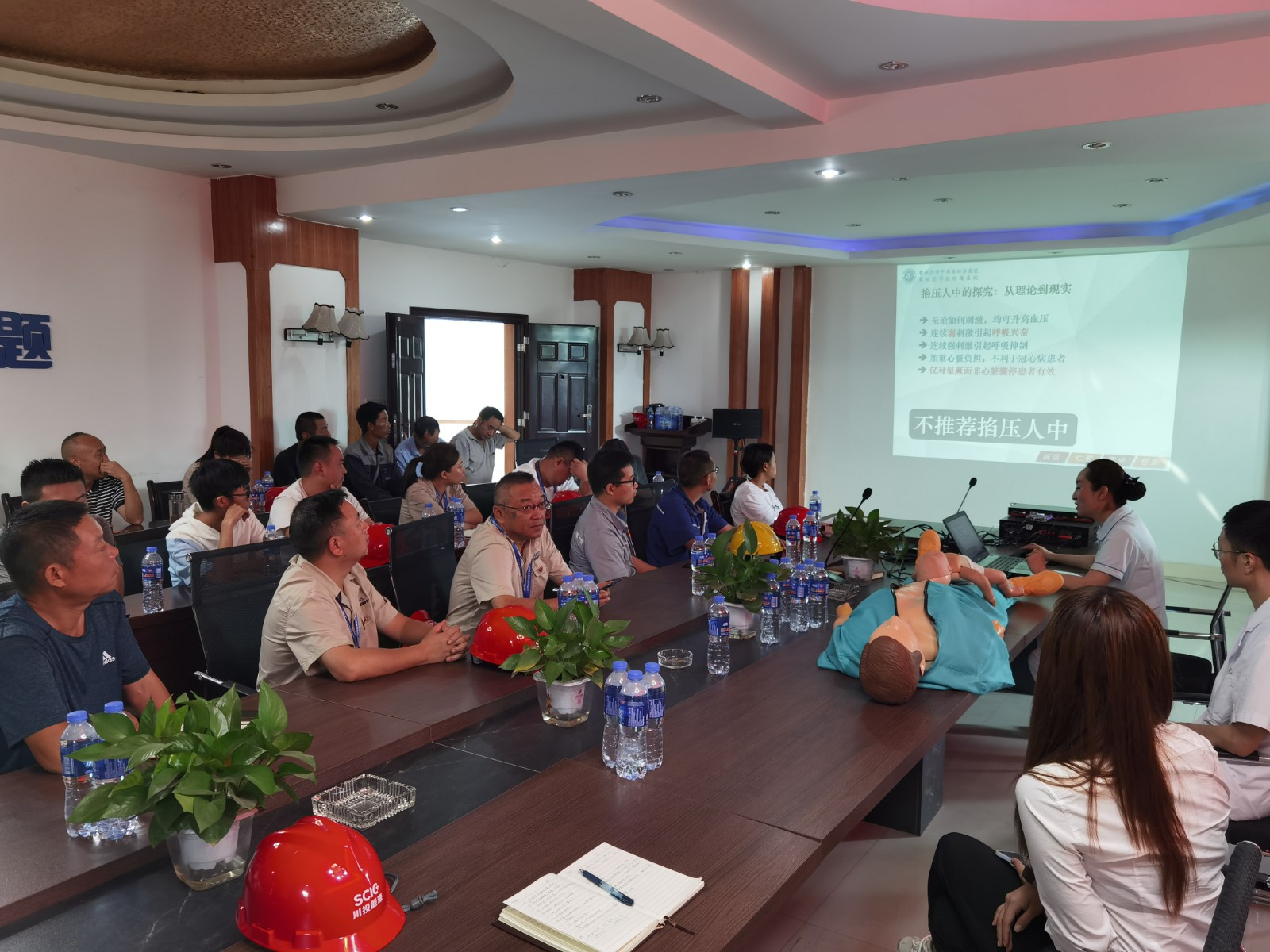 本次培訓(xùn)內(nèi)容包括心肺復(fù)蘇搶救、現(xiàn)場(chǎng)處置急救兩部分。培訓(xùn)老師首先對(duì)心肺復(fù)蘇被搶救人員的表現(xiàn)癥狀、搶救過(guò)程、注意事項(xiàng)等理論知識(shí)進(jìn)行了詳細(xì)的講解;其次結(jié)合日常生活和工程建設(shè)過(guò)程中可能發(fā)生的呼吸道異物堵塞、外傷現(xiàn)場(chǎng)止血和包扎、燙傷、犬傷(狂犬病)等現(xiàn)場(chǎng)搶救理論知識(shí)進(jìn)行了詳細(xì)講解。理論知識(shí)講解結(jié)束后,培訓(xùn)老師以學(xué)員為模特進(jìn)行了外傷包扎操作演示;由學(xué)員利用教學(xué)模型逐一進(jìn)行了心肺復(fù)蘇實(shí)際操作練習(xí),培訓(xùn)老師全程進(jìn)行耐心的糾正和指導(dǎo),直至學(xué)員操作合格。