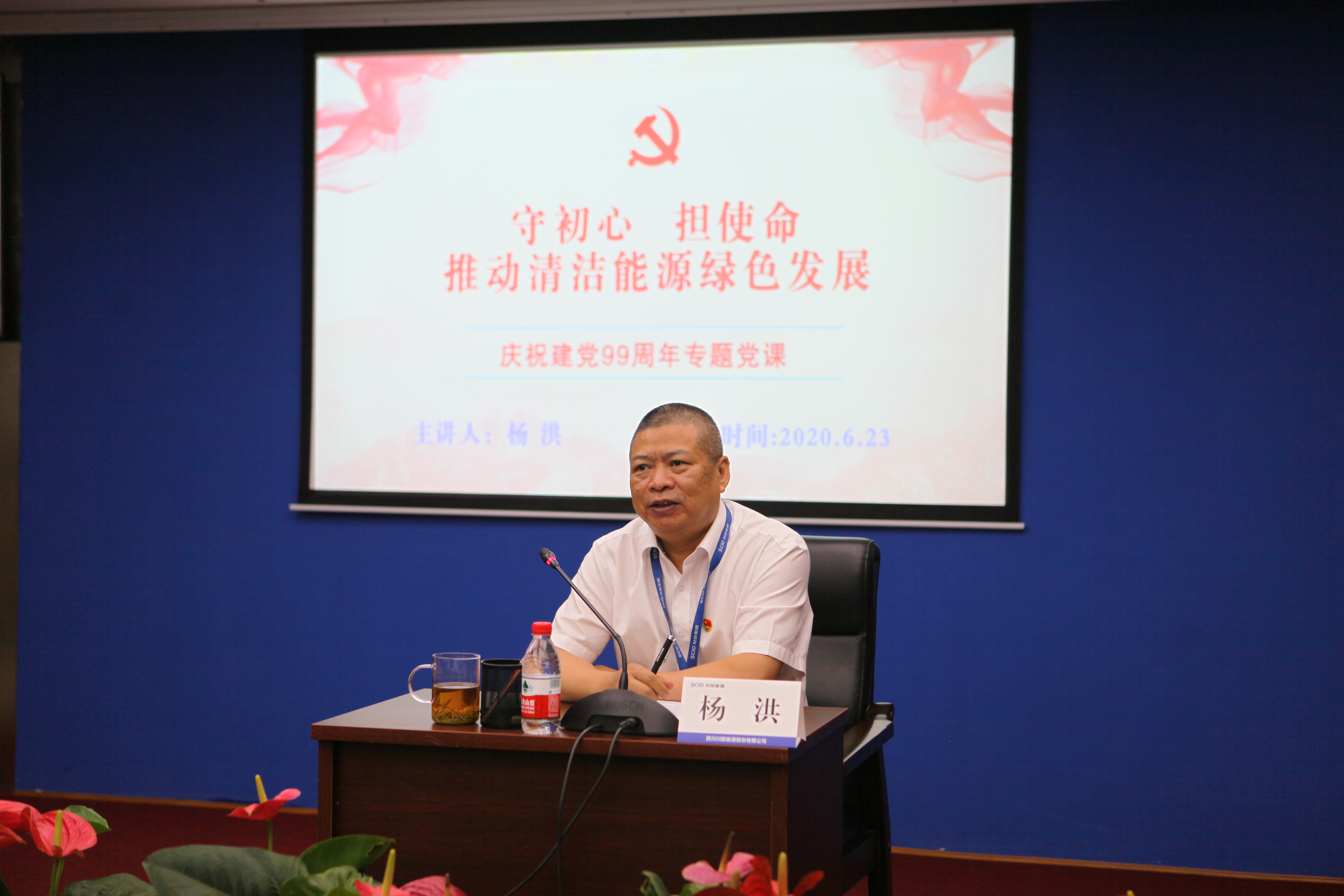 值此川投能源“紅色引擎藍(lán)籌先鋒”(簡(jiǎn)稱“五個(gè)先鋒”)黨建品牌創(chuàng)建工作引向深入之際,6月23日,川投能源黨委采用現(xiàn)場(chǎng)和視頻會(huì)議相結(jié)合的方式,以黨員承諾踐諾、黨員先鋒隊(duì)授旗、發(fā)布公司黨建品牌標(biāo)識(shí)以及公司黨委書記講黨課等內(nèi)容為載體,組織全體黨員、入黨積極份子、新黨員代表隆重召開紀(jì)念建黨九十九周年大會(huì),為中國(guó)共產(chǎn)黨第99個(gè)生日獻(xiàn)上賀禮。公司黨委副書記、工會(huì)主席楊超龍主持會(huì)議。